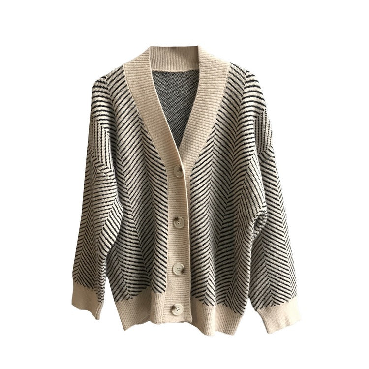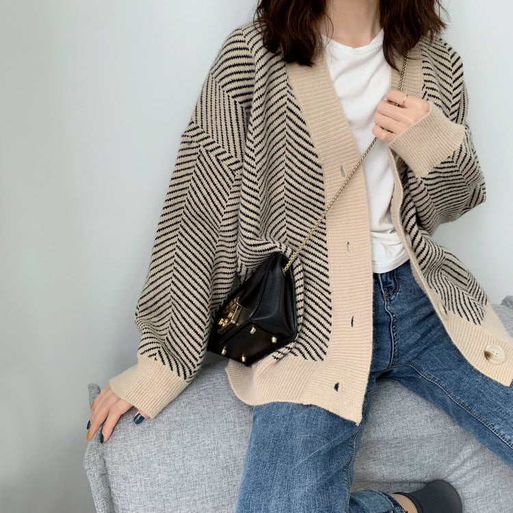 厚手ストライプニットカーディガン女性用 秋シンプル気質 Vネック長袖ゆったりトップ